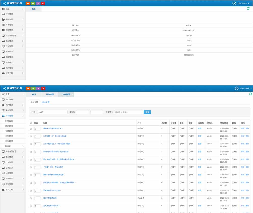 在管理员模块中可操作模块整整26项、友情链接、广告管理、付款记录、订单报表、订单列表、会员管理、商品管理、店铺管理、基础邮寄表、国家地区、新闻列表添加新闻、新闻类别、商品类别、修改密码、系统管理员、模块管理、大家、数据库测试、数据库升级、数据库优化、数据库恢复等等其中每一项都可以单独做修改,并且不需要的选项可以删除。